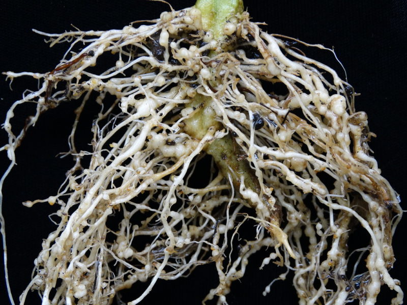 1. Some nematodes are crop pests, feeding on or infecting roots, bulbs or leaves. The image above is a typical example of a Root-Knot Nematode or Meloidogyne spp. infection of roots. (Photo: Scot Nelson, 2017. Meloidogyne incognita on Solanum lycopersicum.).
