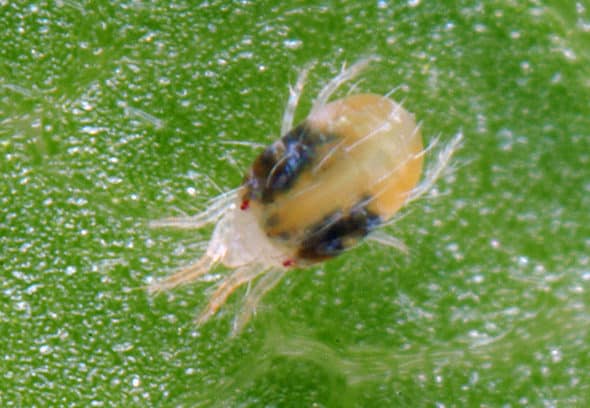 Red spider mites also known as two-spotted mites, or scientifically as Tetranychus urticae, are arthropods which use their needle-like mouthparts to feed on plant tissue, causing yellowing or greying on leaves. If not brought under control, they can cause plants to completely lose their leaves. When T. urticae feed on flowers brown speckles appear on the petals.