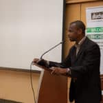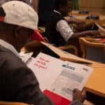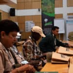 Constance Muholo, Dudutech Macro QC Manager, inspecting a sample under a microscope during the training session.