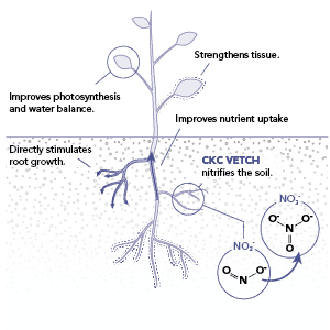 CKC VETCH contains Rhizobium leguminosarum which provides plants with bio-available nitrogen (N), promoting root and vegetative development. N is required for chlorophyll production and amino acid synthesis.