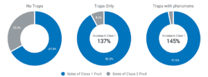 Beyond the scope of pure observation, these sticky traps are also a valuable part of successful IPM practices. When researchers (Kirk and Sampson, 2013) looked at the potential economic returns gained from using traps and pheromones as part of a crop protection strategy for strawberries, they revealed a quality effect on the overall yield. The charts below illustrate their findings: