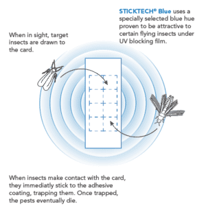 - Sticktech – uses blue or yellow sticky cards which are placed between 10 – 15 cm above the plant canopy.